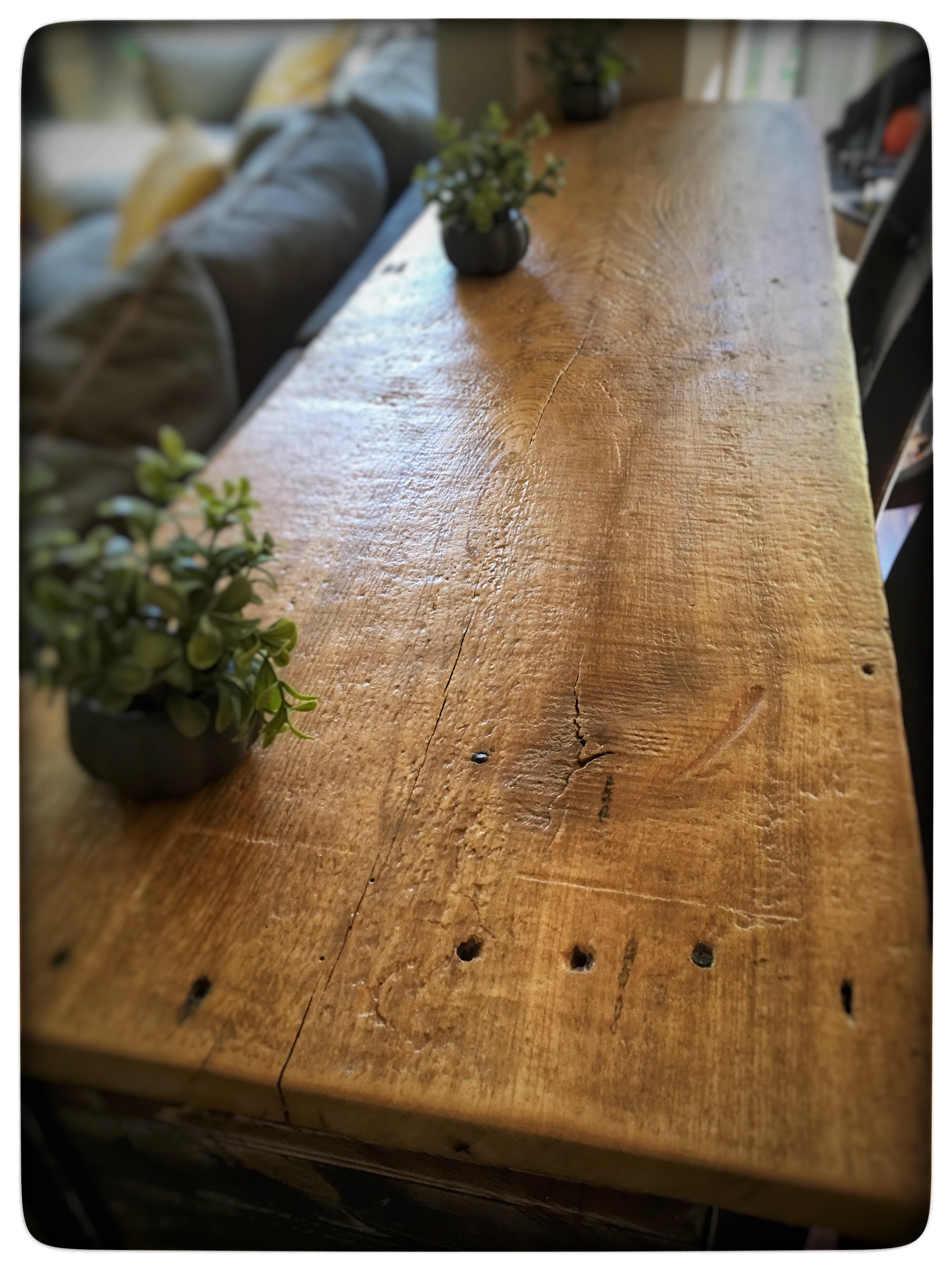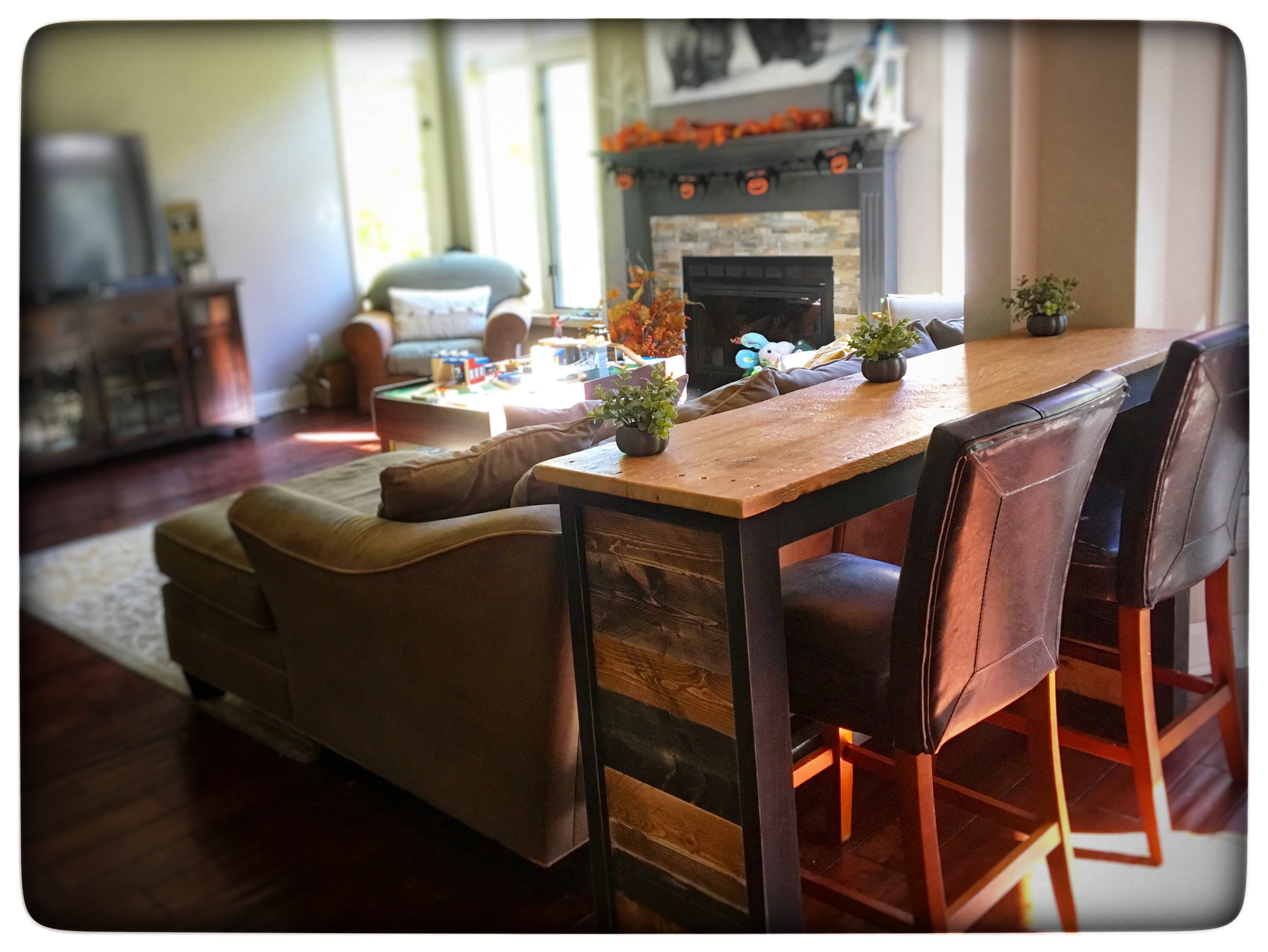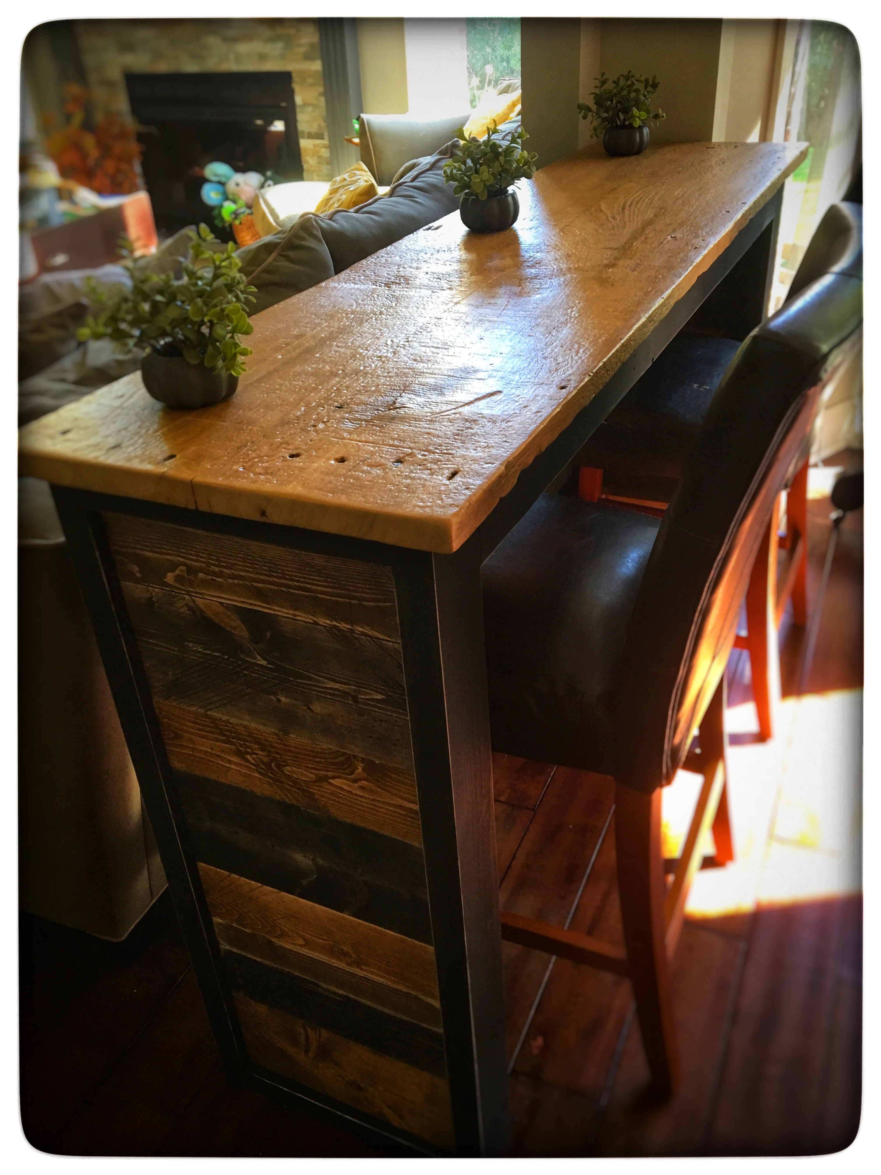 And here it is, with the sun shining on that gorgeous top! We absolutely love it! It was fast, easy and FREE!! If you decide to use my plan to build your own sofa table, please tag SubUrbanRustic on social media or post it on my SubUrbanRustic Facebook Page.