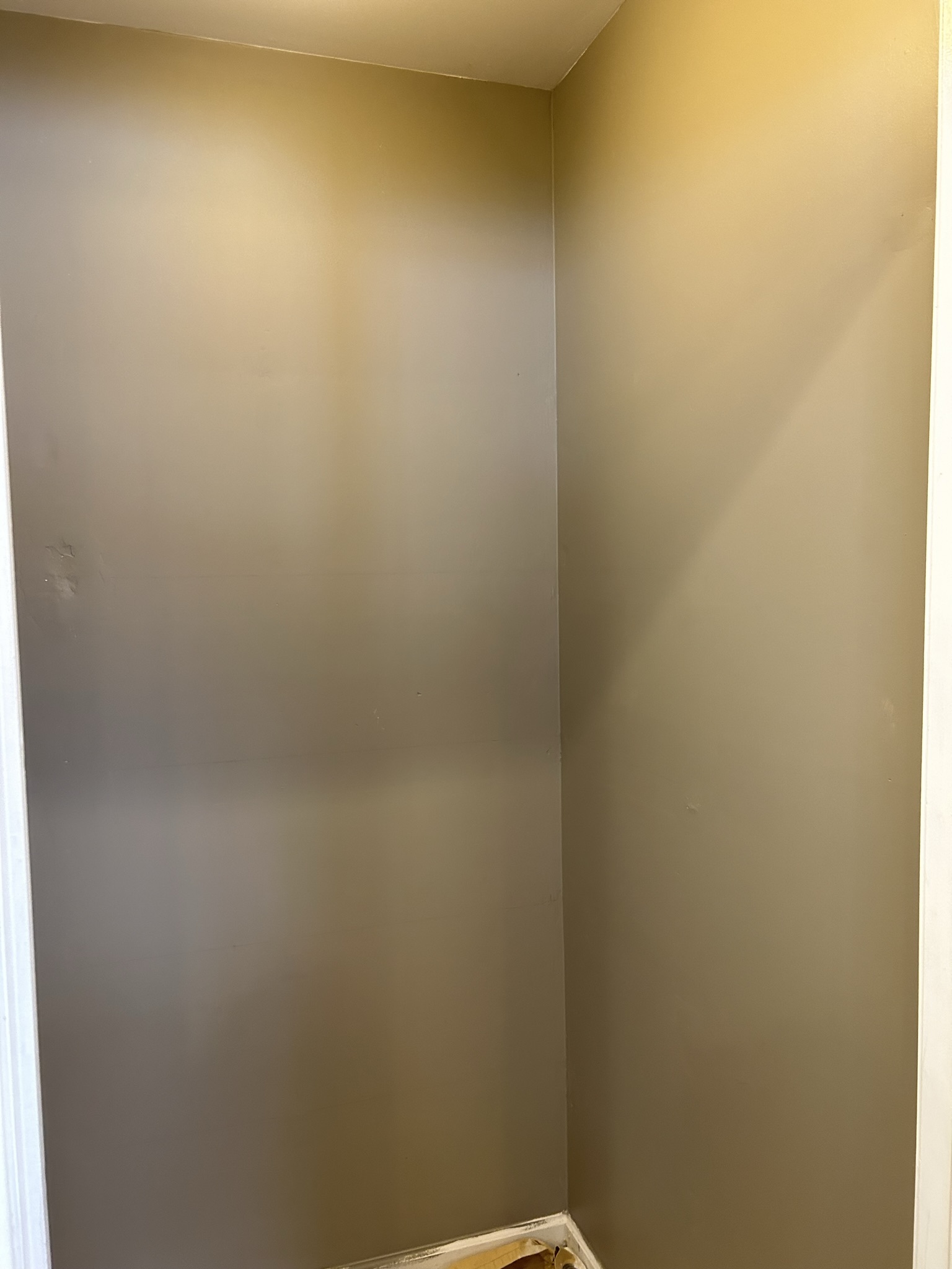 Now for the part that I really regret: the paint color. Instead of buying a quart of Revere Pewter to match the kitchen, in an attempt to save a few dollars, I used leftover paint in a color called Indian River. It's a few shades darker than Revere Pewter, and while I like the color in our great room, it's too dark for the pantry.