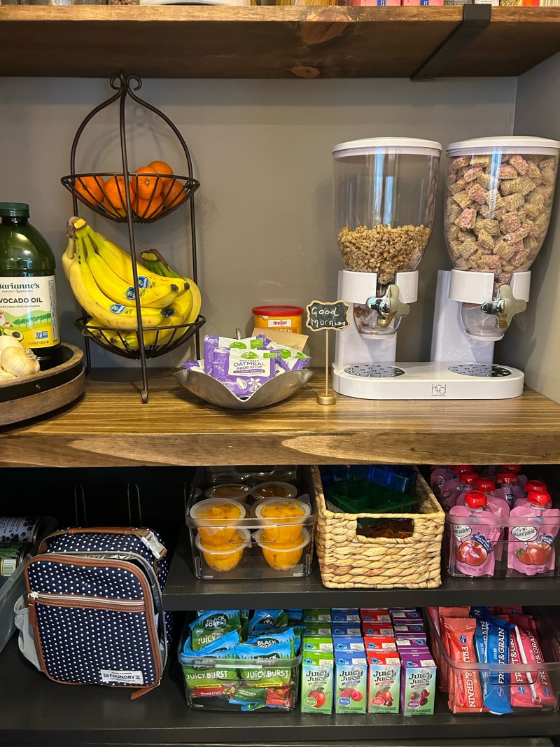 I wanted the breakfast bar to feel like a continental breakfast at a hotel. It has early morning road trip vibes! Some fresh fruit, an assortment of oatmeal, and these fun cereal dispensers that hold 2.5 boxes of cereal each! Before, I would find empty boxes of cereal in the pantry, but now I can see when I am running low. Teens love their cereal!